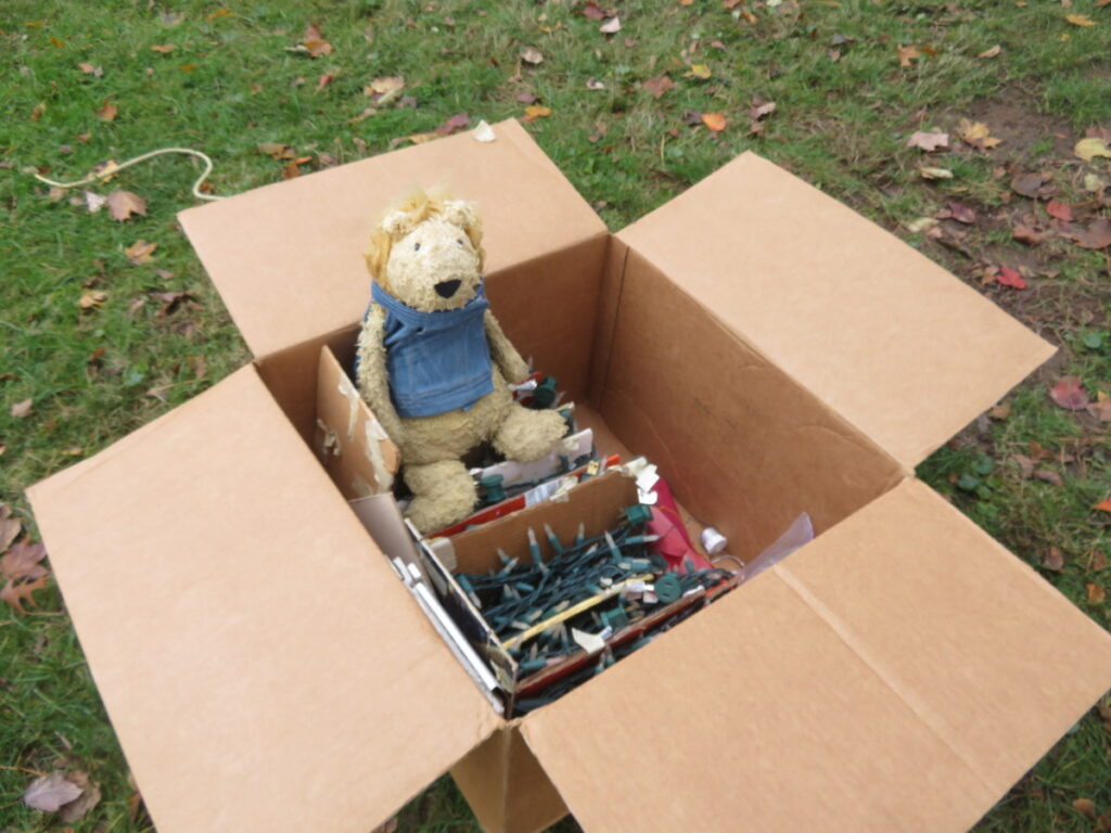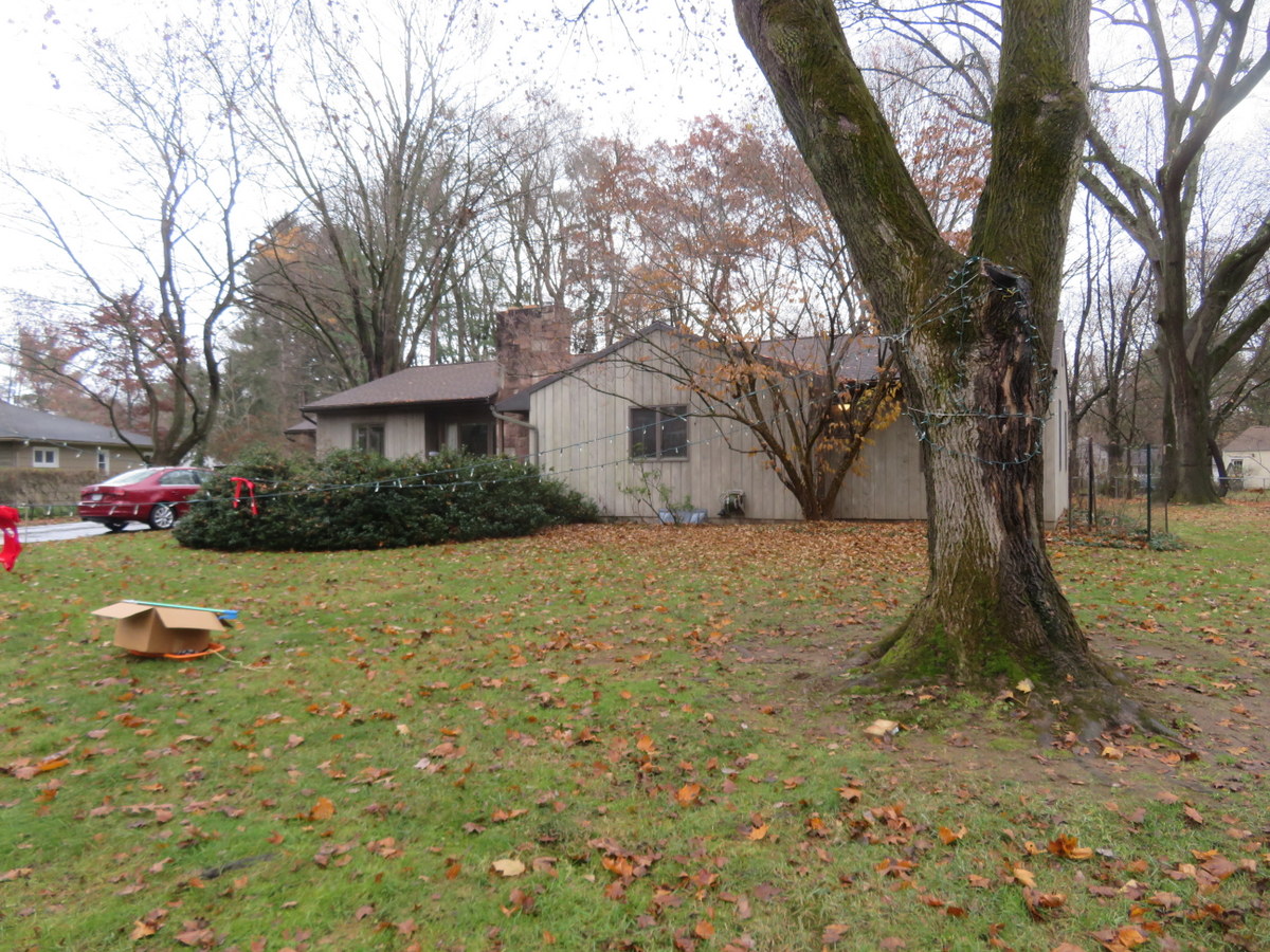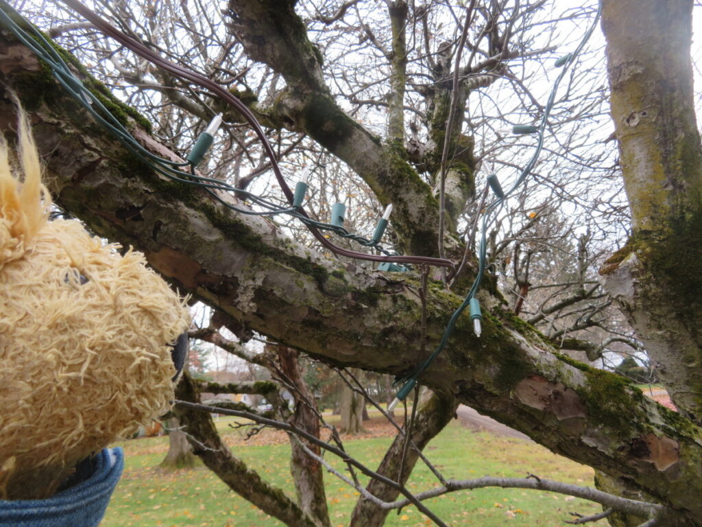 Grandma likes to wait to start putting up the holiday lights in front until the big leaf pile is collected. She doesn’t want the scraper to snag the strings of lights that run in between trees. After the town crew came through, I helped her string the lights on the two remaining apple trees. They’re all up in the branches, so nothing can get snagged. We put up five strings of lights! I made sure the power plug could reach into the front lamp post when we’re ready to have the lights turn on. That will be December 2nd, to remember Uncle Bill.