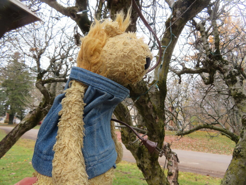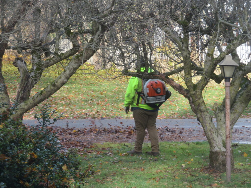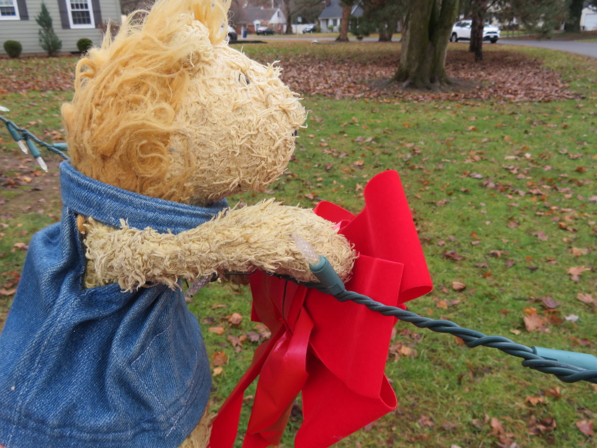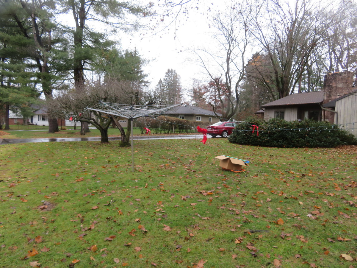 Grandma likes to wait to start putting up the holiday lights in front until the big leaf pile is collected. She doesn’t want the scraper to snag the strings of lights that run in between trees. After the town crew came through, I helped her string the lights on the two remaining apple trees. They’re all up in the branches, so nothing can get snagged. We put up five strings of lights! I made sure the power plug could reach into the front lamp post when we’re ready to have the lights turn on. That will be December 2nd, to remember Uncle Bill.
