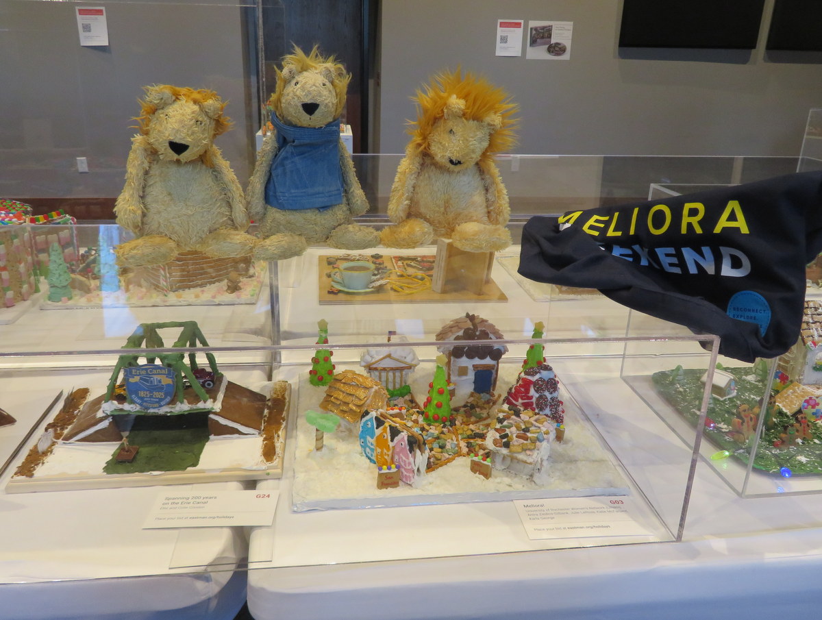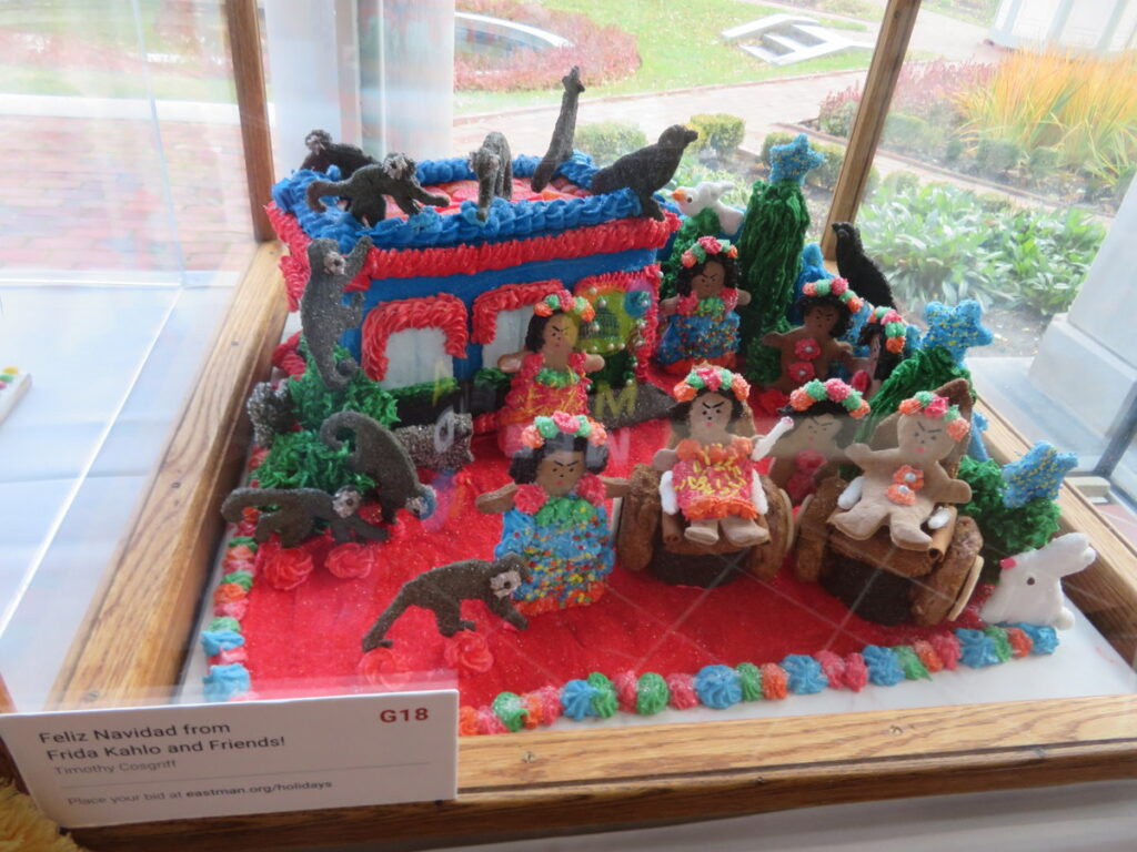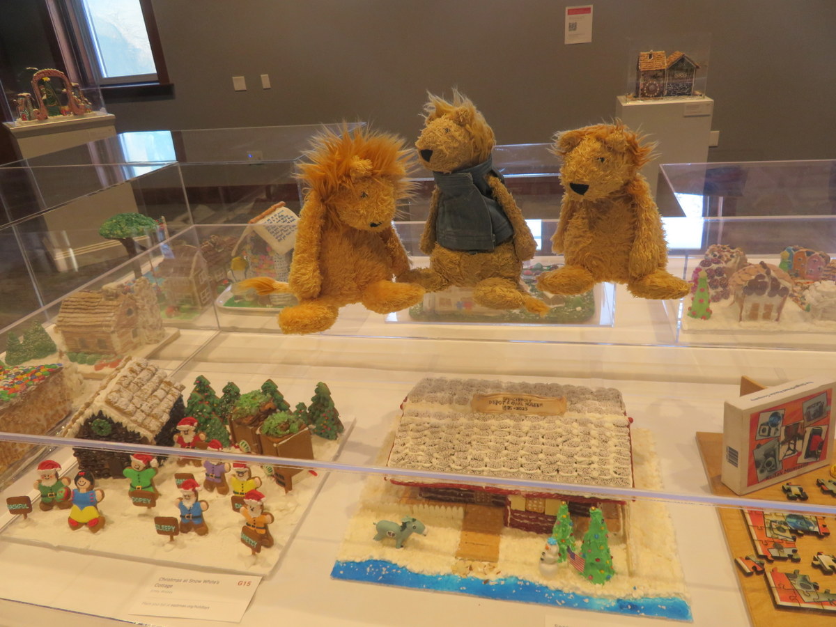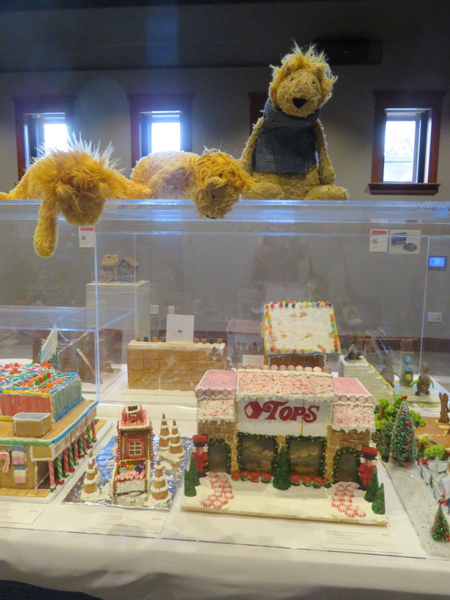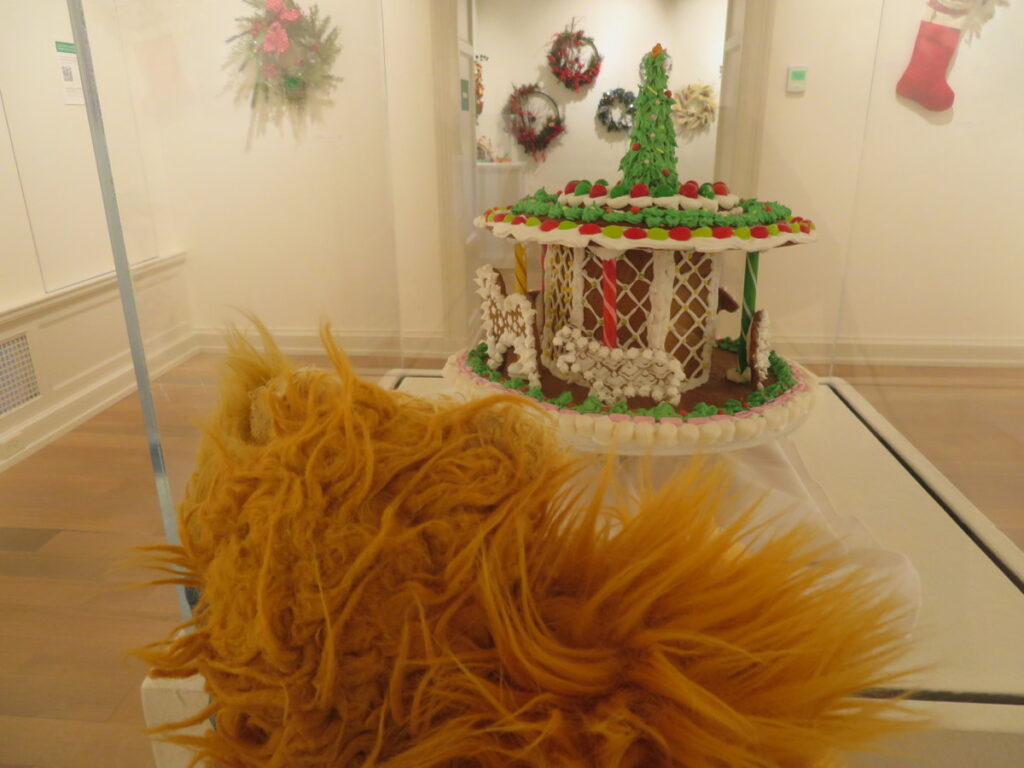 Last Wednesday, Grandma took me and my pride on a big adventure! We went to the George Eastman House and Museum to see the holiday displays. I was happy it was mild, dry weather so my pride could see the Colorama display in the parking lot. When we got to the admission desk, the clerk said that lions could get in free! We came to see the gingerbread house display. It started right inside the new entrance and continued in the corridor connecting the museum and Eastman’s mansion. The windows there give views of the east garden, too!