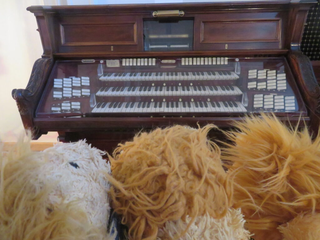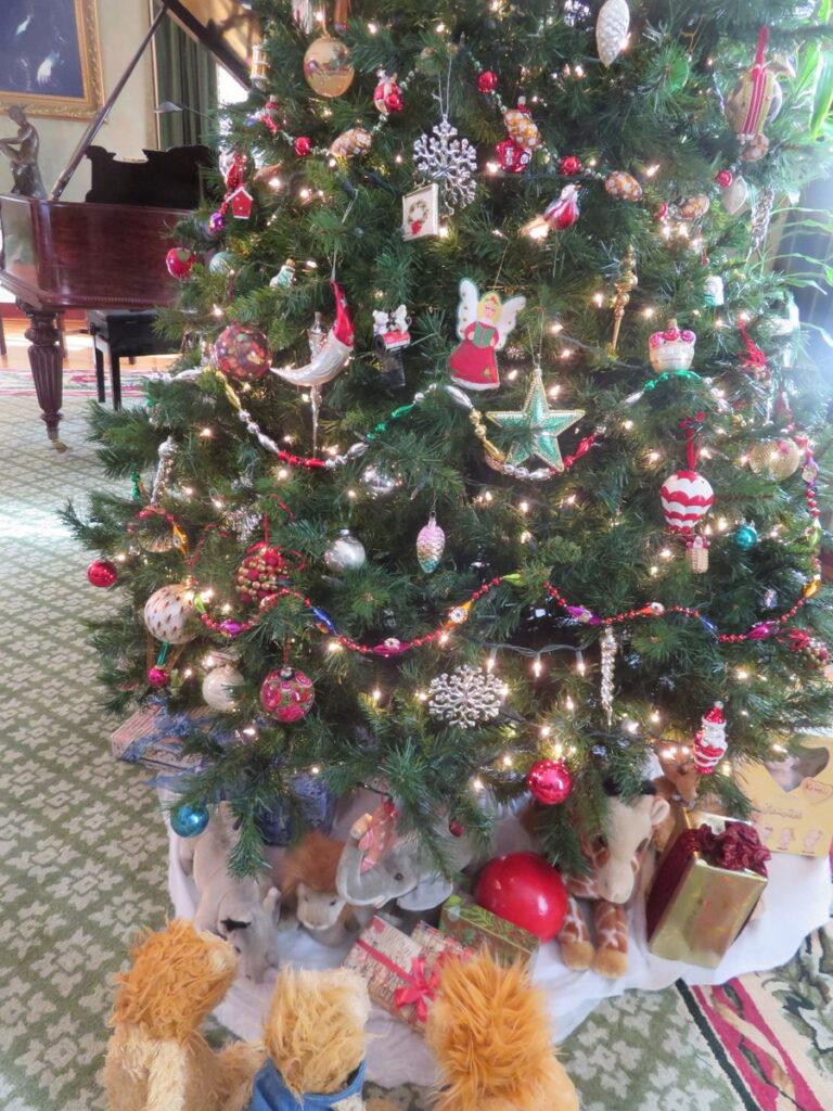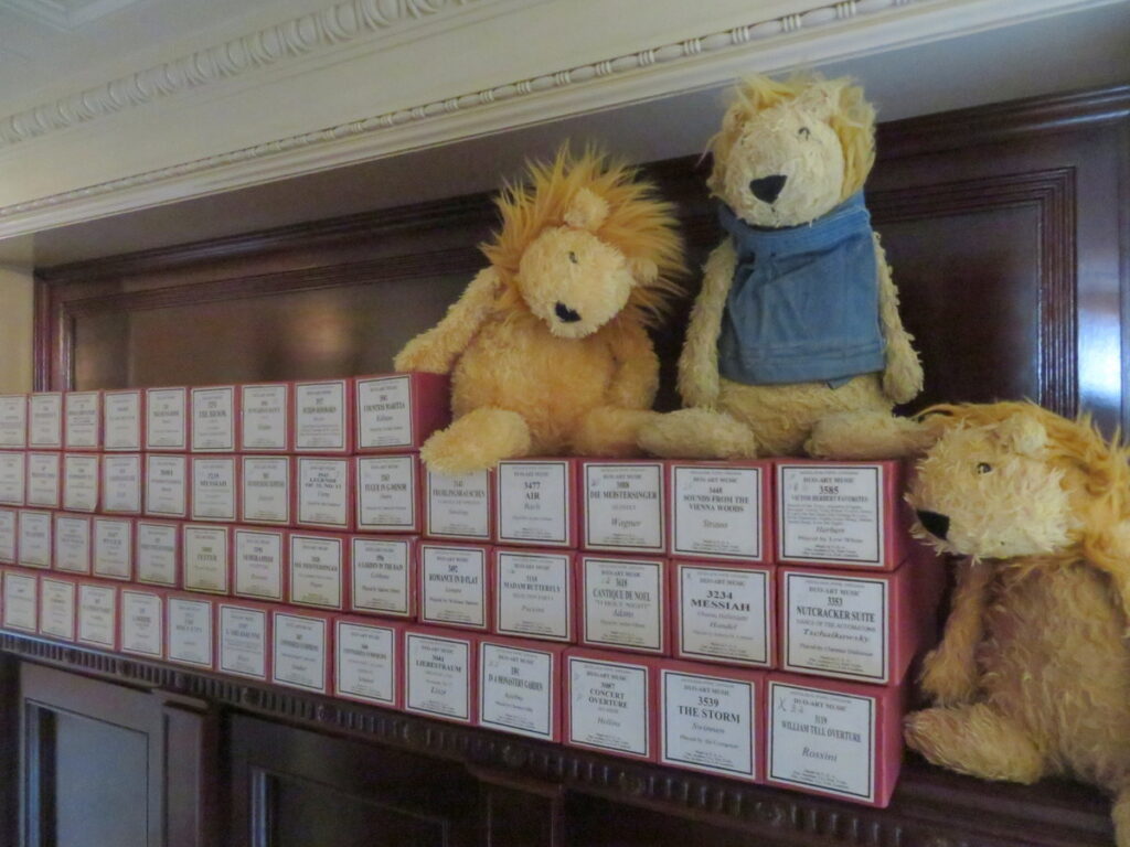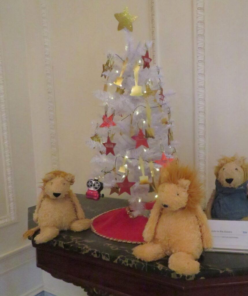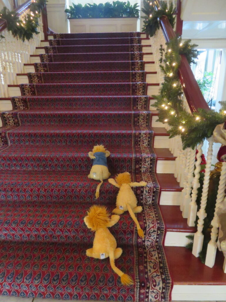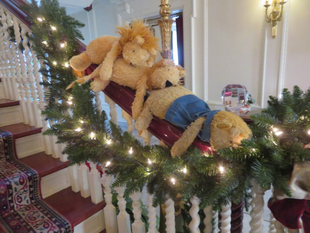 Once we were in Eastman’s house, we looked at some decorated table-top trees and visited the big tree in the parlor. Guess what? We found a lion cousin there and made friends with the other animals, too! Then I showed my pride the stack of player organ rolls stored underneath the stairs.