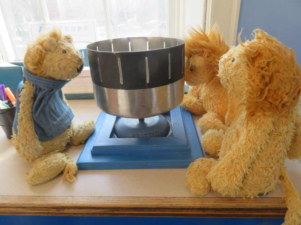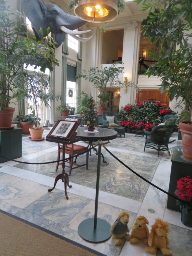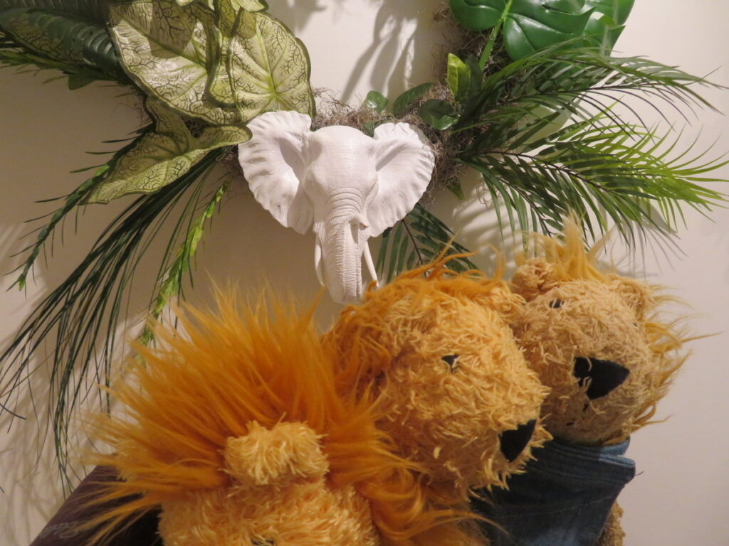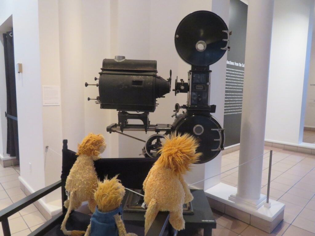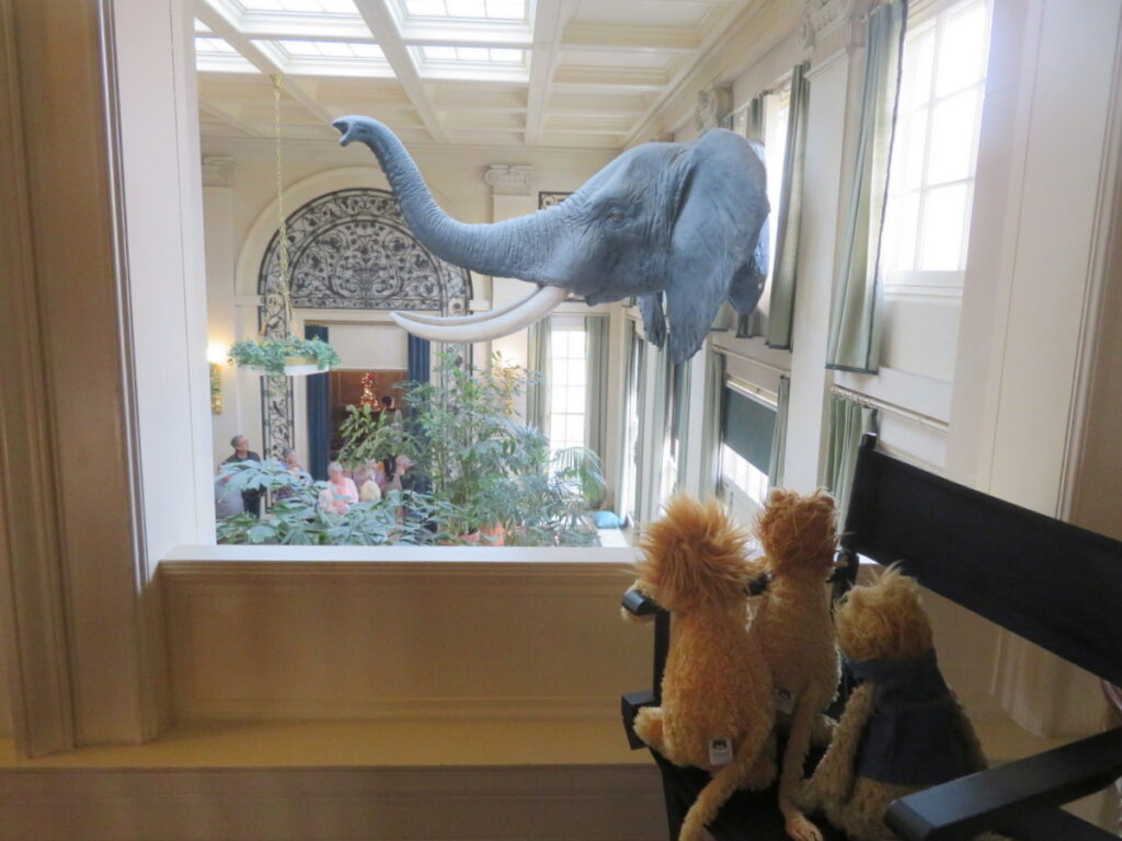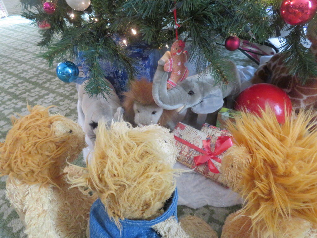 Once we were in Eastman’s house, we looked at some decorated table-top trees and visited the big tree in the parlor. Guess what? We found a lion cousin there and made friends with the other animals, too! Then I showed my pride the stack of player organ rolls stored underneath the stairs.
