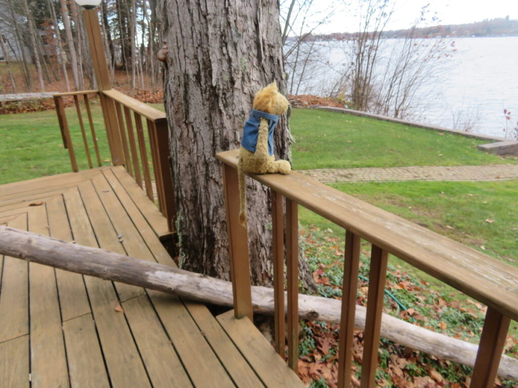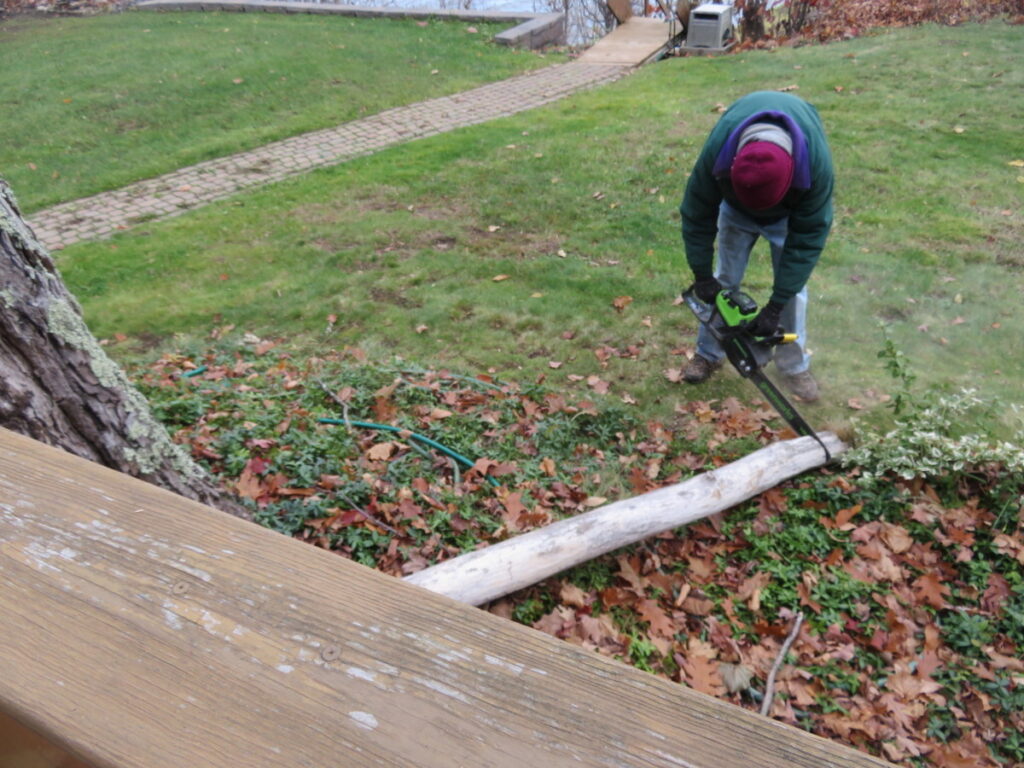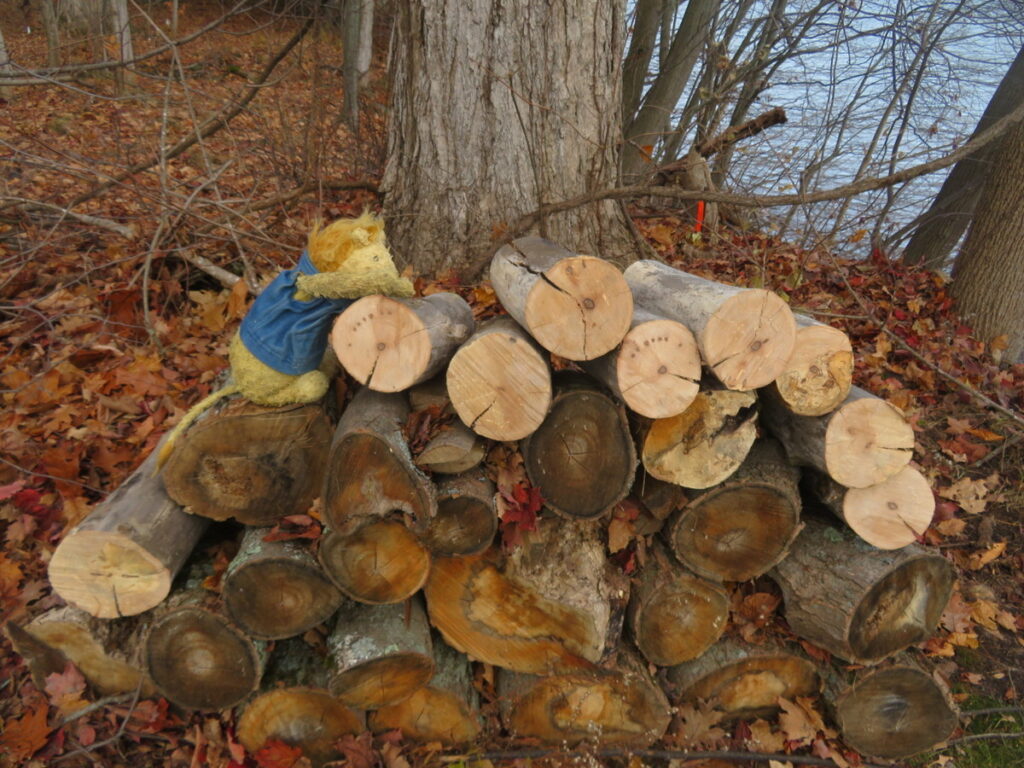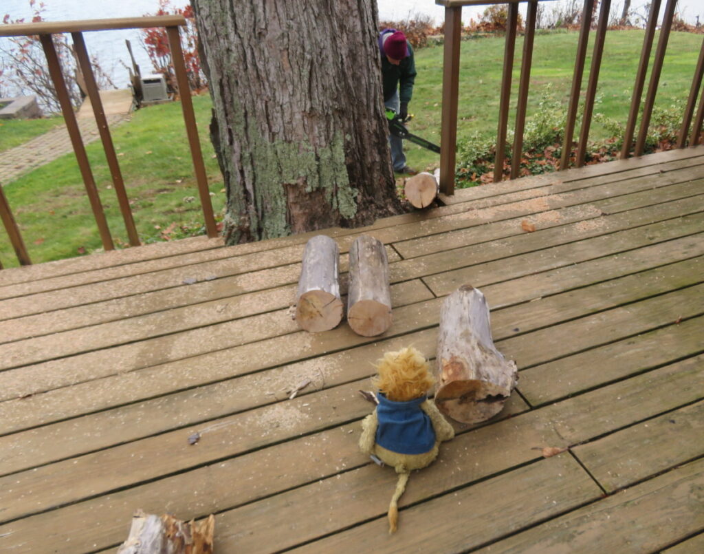 Last Friday and Saturday, the weather was dry enough to finish up leaf raking at the bay. We put up the deer fencing around the rhododendron, too. There was a really big branch down in front of the porch. We were lucky it didn’t break anything when it fell down! Grandpa sawed it up and I helped Grandma stack it for firewood.