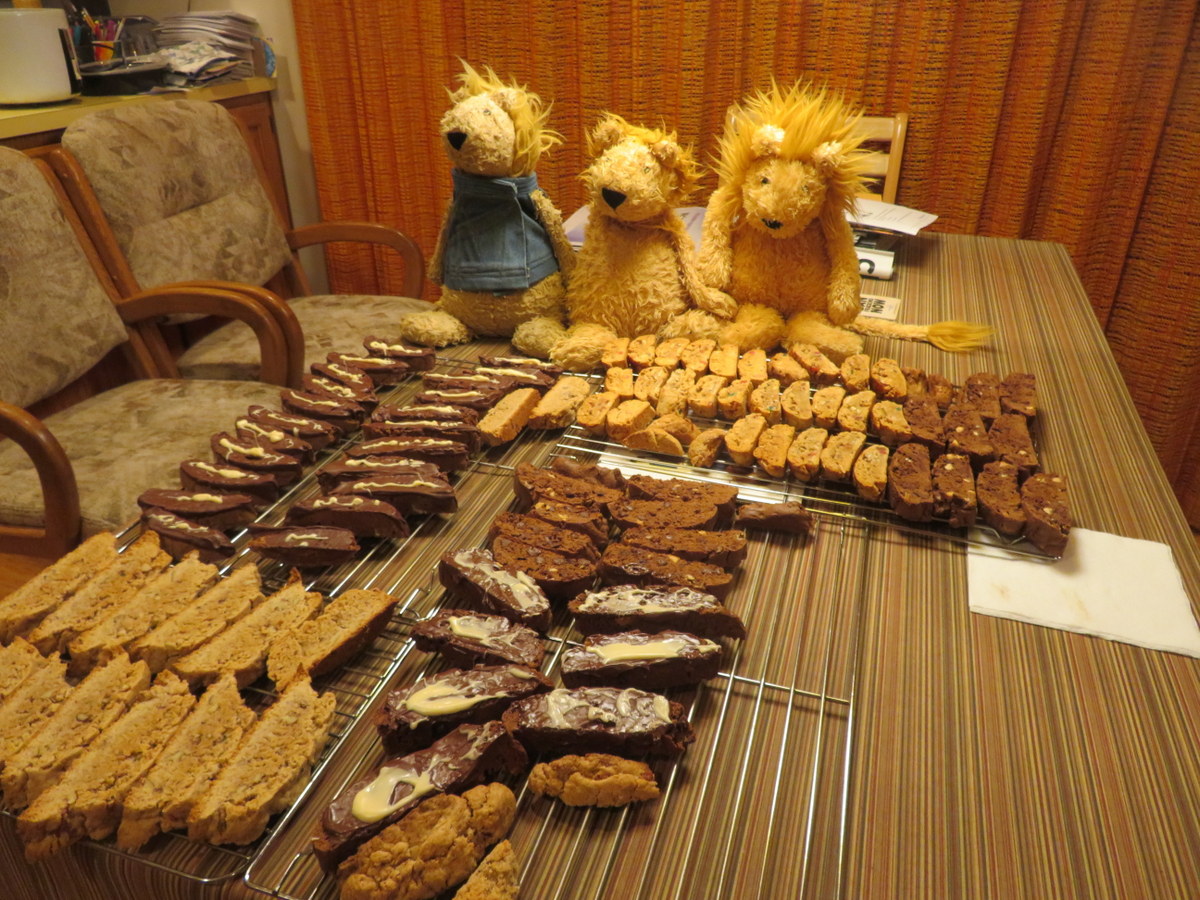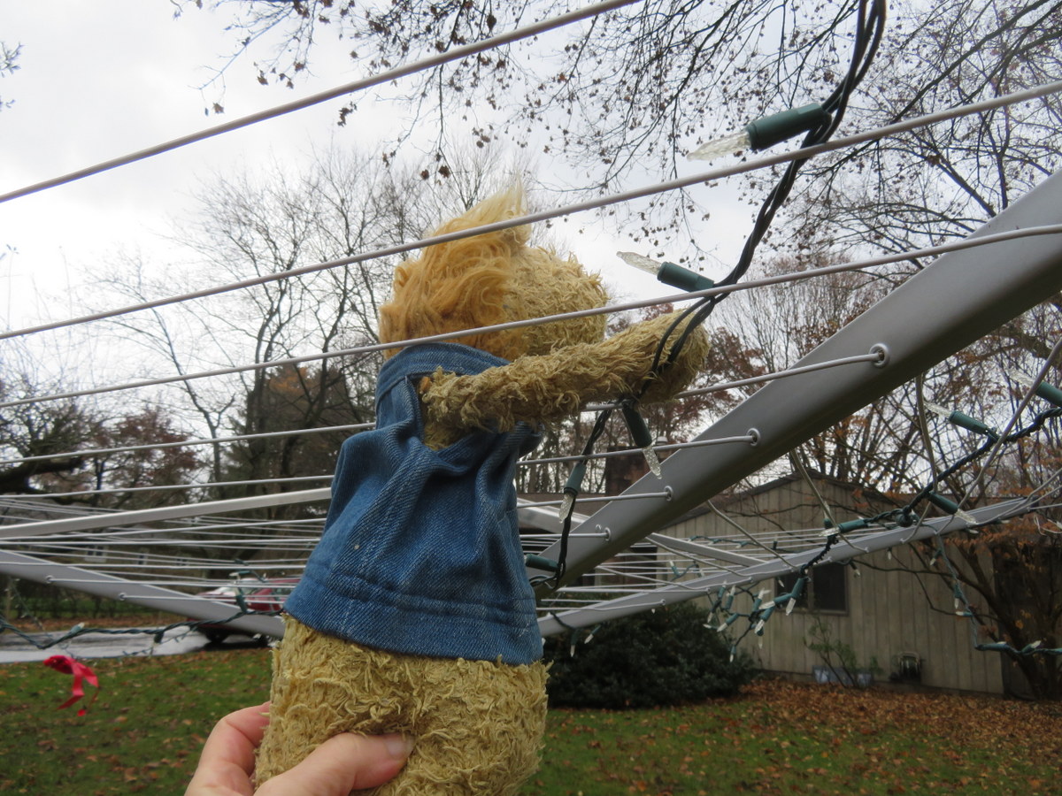 Sunday afternoon, Grandma decided it was time to replenish the supply of biscotti. She made four kinds, and they all went into the freezer. Today was the day a cold front and snow were supposed to move in, so Grandma got out this morning to put up the rest of the holiday lights. I helped string them from the second apple tree to the clothesline tree and then on to the maple tree. I made sure we put up red bows on all the low-hanging strings of lights, so no one will walk into them! It’s hard to know how they’ll look in the dark until they turn on next week. I hope we did a good job!