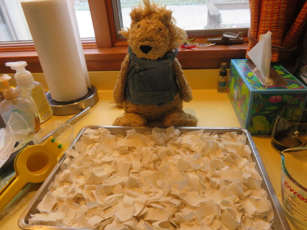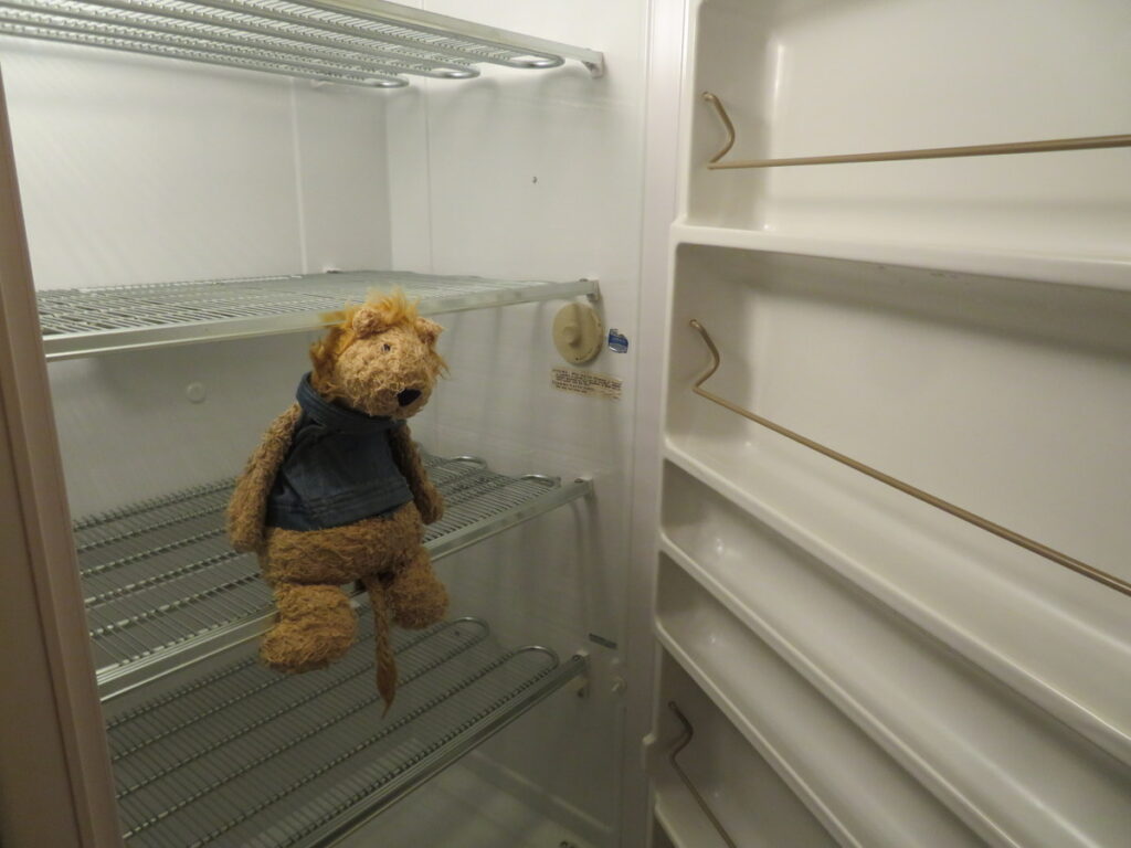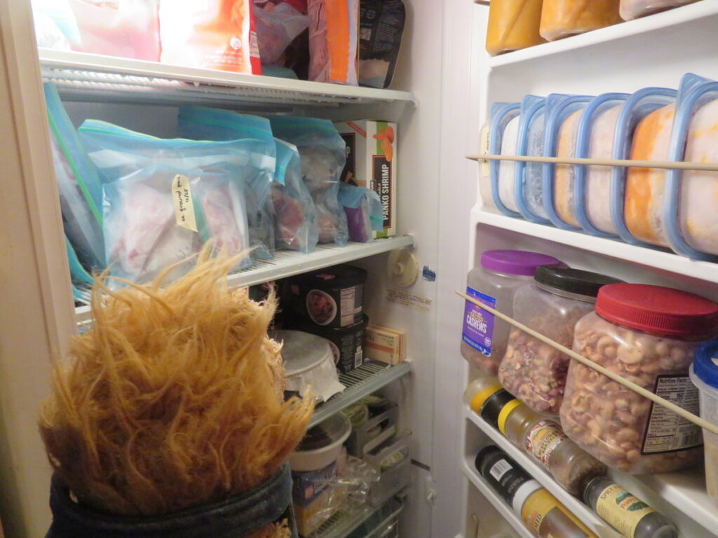 Getting the phyllo out of the freezer reminded us that it was time to defrost! Most of the coldest weather was over, but we had a below-freezing night to help us get that done! I helped Grandma and Grandpa put all the food from the freezer into coolers. Those went into the garage. Then Grandpa put a hair dryer in the freezer to melt the ice. All the melt water came running out of the drain tube! I let Grandma know when the catch pan needed to be emptied! When all the ice was out, Grandma dried off the shelves and turned the freezer back on. Once it was cold enough, all the food came back from the garage.