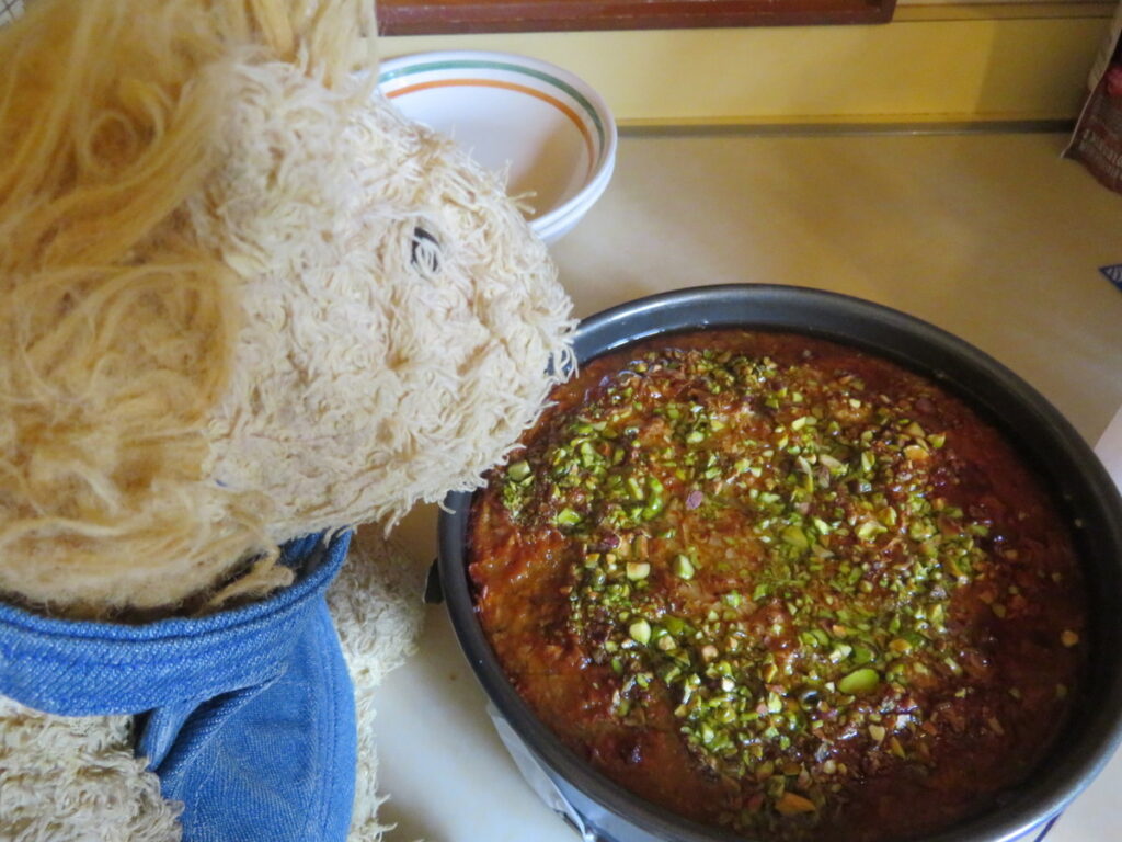 The middle of last month, I helped Grandma make a broken phyllo cake. We cut a package of phyllo into strips and toasted them. Then we stirred them into an egg batter, instead of using flour to make a cake. There was a layer of pistachios, too! Grandma decided it was interesting, but not worth doing again.