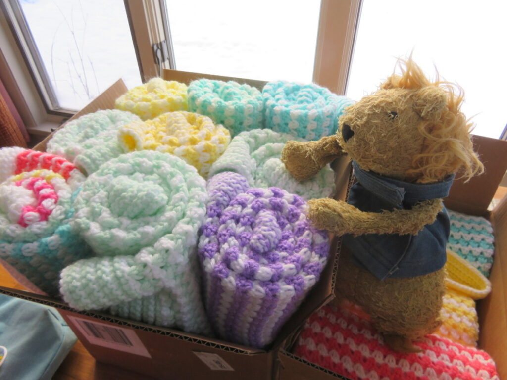 The day after our cold night, the first of my flower friends bloomed! The first ones I saw were the crocus that come up where they weren’t planted. Then I found a crocus in the south foundation planting. Some years, the daffodils are in bloom by mid-March, but not this year! The next day, St. Patrick’s Day, we had snow again! I helped Grandma pack up the baby blankets she’s crocheted this year to go to the babies in the neonatal intensive care unit.