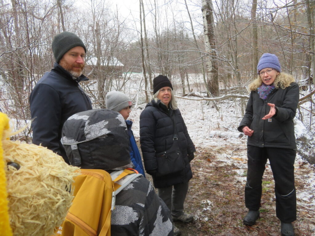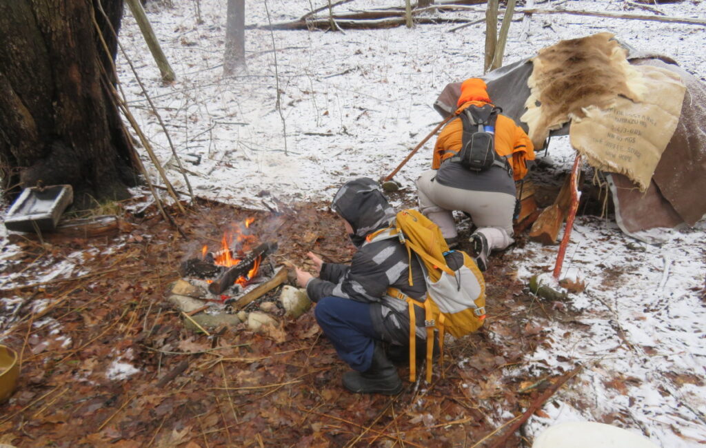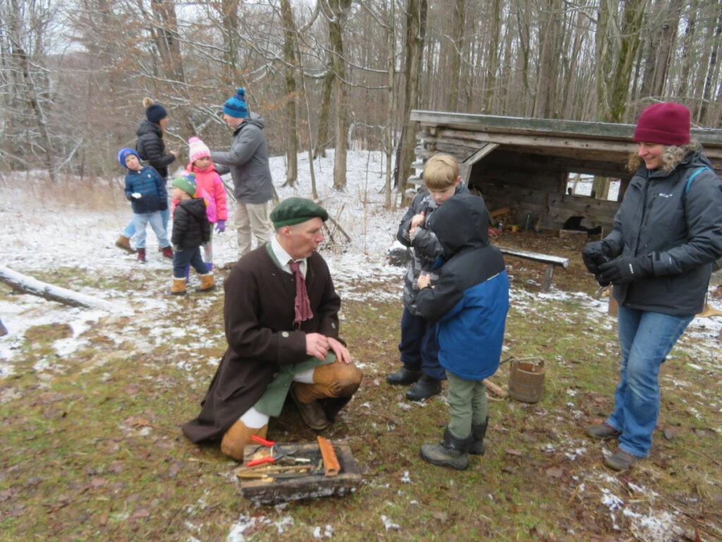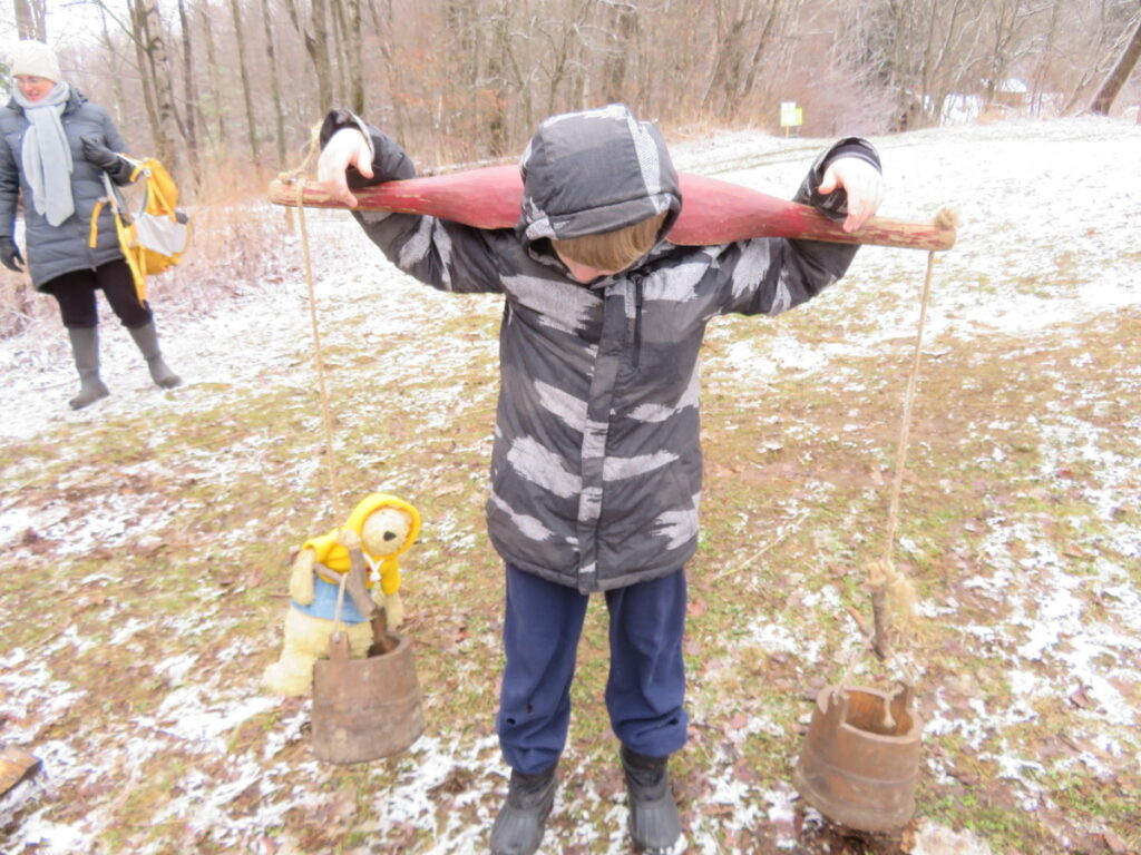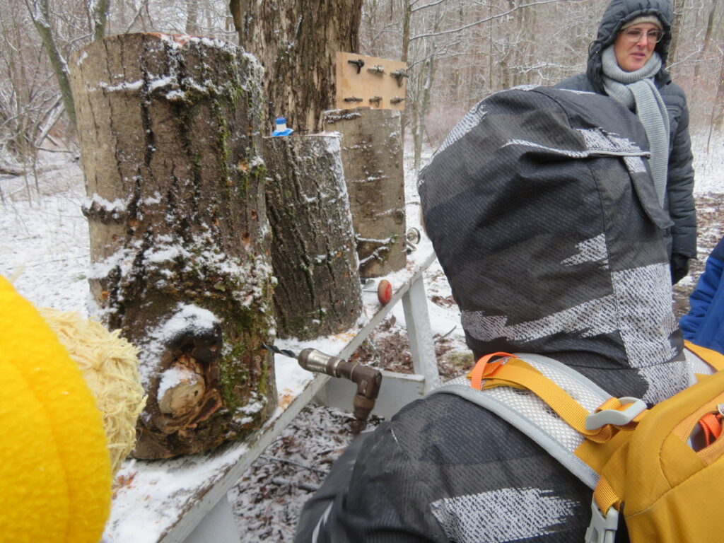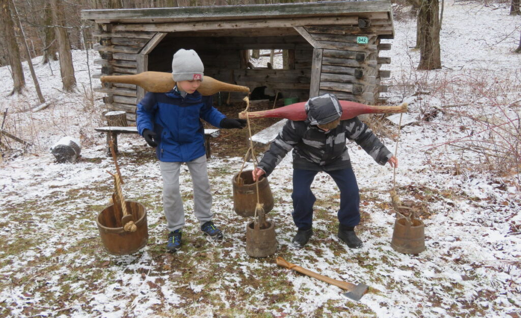 Cam had never been on the Maple Trail before, so Thomas had a lot to show him! They practiced drilling tap holes and learned how the Haudensaunee turned sap into sugar. At the Pioneer Cabin, they made spigots for the tap holes and got to carry the sap buckets around. I even got a ride!