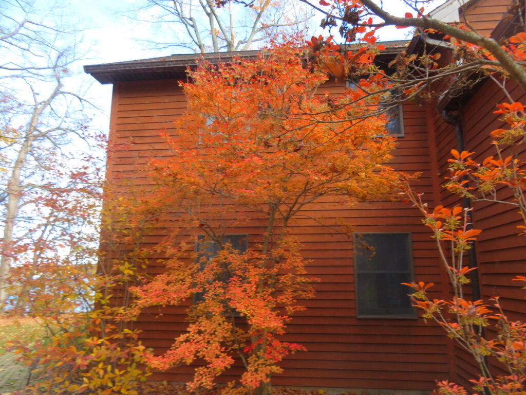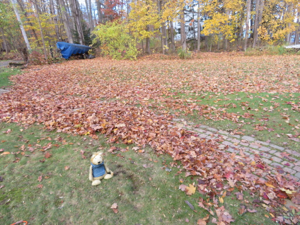 Last Saturday we were out at the bay to do the final leaf raking there. Grandma got started in the morning and cleared some parts of the lawn. Then Uncle Steven’s family came out to help. Aunt Kara has a backpack leaf blower and made quick work of the rest of the leaves. Grandma and Uncle Steven moved all the leaf piles off the grass. Then Grandpa got the mower going and Aunt Kara mowed the lawn, too! There are still some pretty leaves on the bushes, but the lawn at the bay is set for winter.