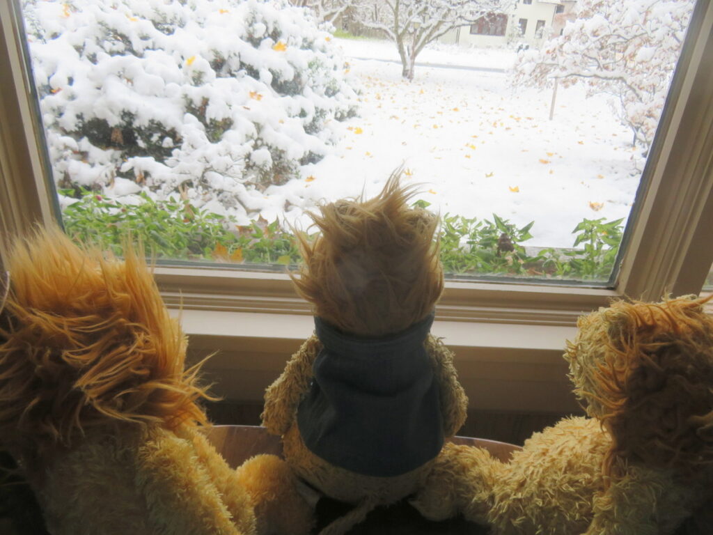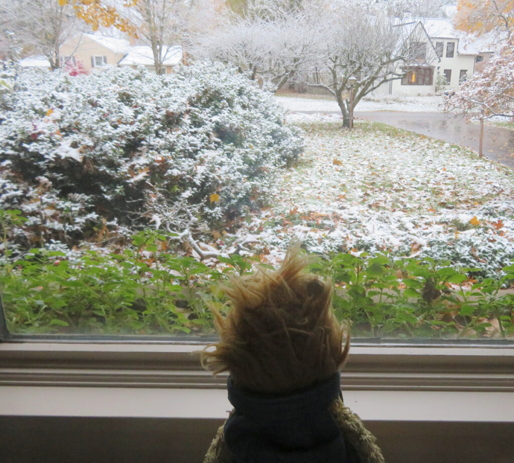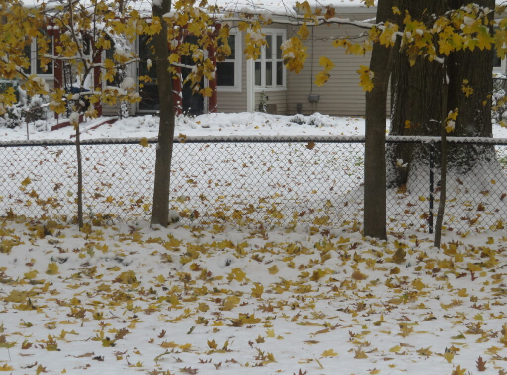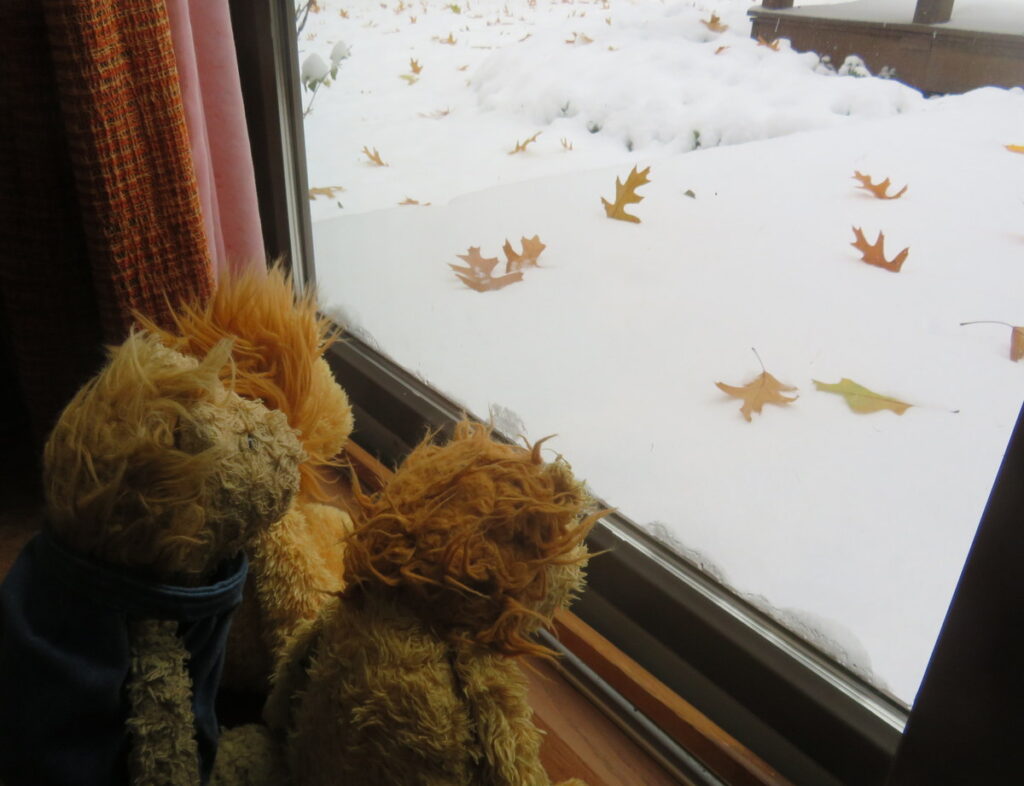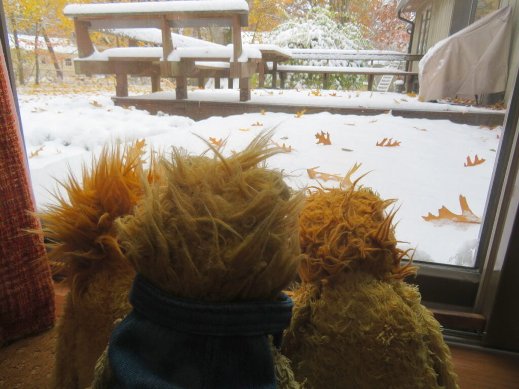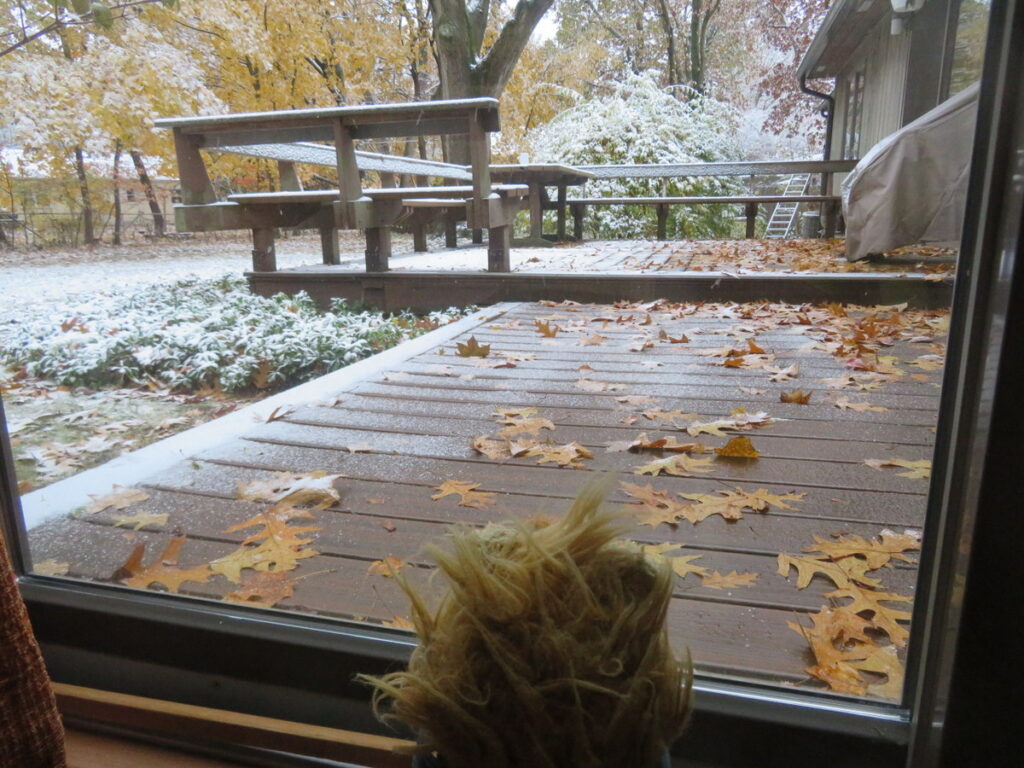 We had more snow overnight! My pride looked at the snow and watched all the yellow leaves starting to fall. This snow is supposed to melt later in the week. Do you suppose we can get the yellow leaves added to the leaf pile before the town gets here?