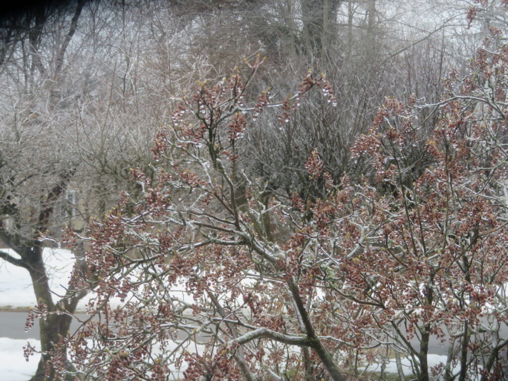 Then we had a night of freezing rain! When I got up, there was ice on all the tree branches. That day, it got even warmer and the ice on the trees and a lot of the snow on the ground melted!