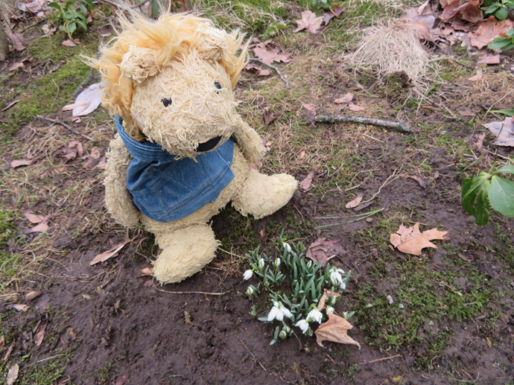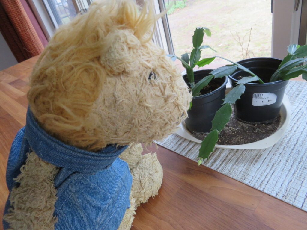 Today it’s cooler and raining. I can see my snowdrop friends are in full bloom, but it’s too wet to go out to say hello. Inside, I’m waiting for a new flower friend. The Christmas cactus plant that Grandma started from a single leaf has two flower buds on it! I don’t know how it got confused about the seasons, since that kind of cactus usually blooms between Thanksgiving and Christmas. These are the first two flower buds ever, so I’ll be happy to see them anyway!