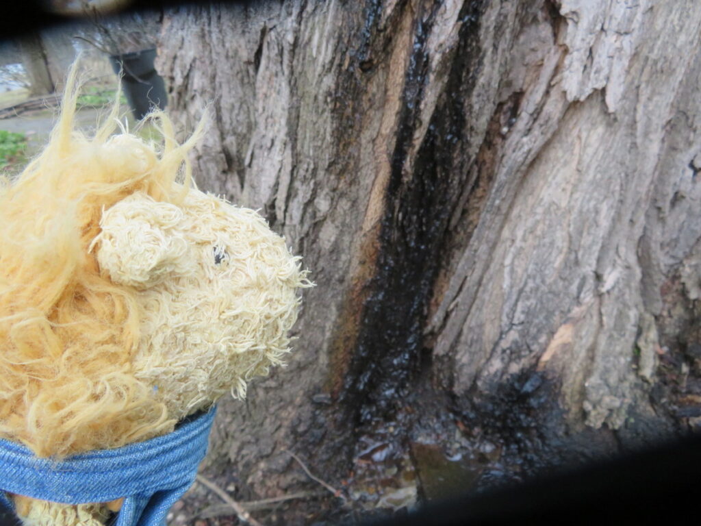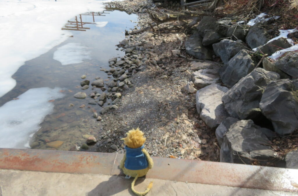 Do you remember the big branch that fell against the deck last fall? It turns out part of it broke off, landed on our roof and put a hole in the shingles! Monday was the first day the repair crew could get in to fix the roof. They threw the branch down for me to see. Then Grandma took me down to the water to see the ice up close. It was starting to melt near the shore, but I couldn’t see any open water anywhere else! I said hello to my primrose friend before we came back to town.